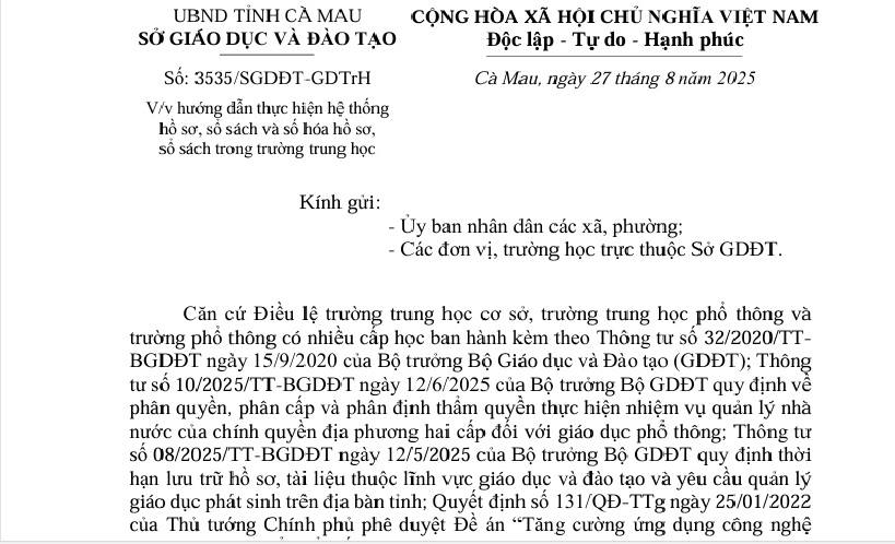 V/v hướng dẫn thực hiện hệ thống hồ sơ, sổ sách và số hóa hồ sơ, sổ sách trong trường trung học